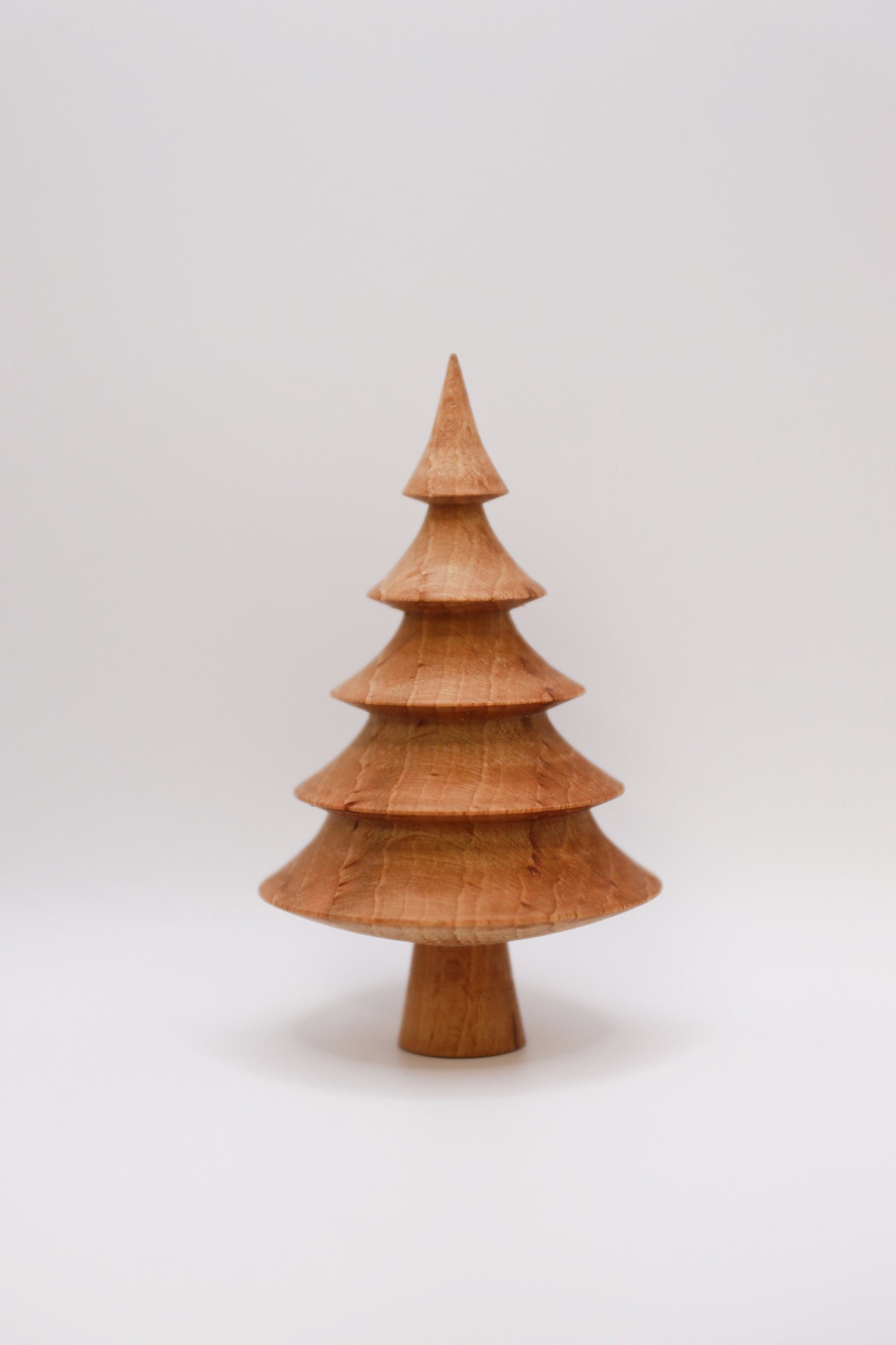 Gedrechselte Tannenbäume in drei verschiedenen Größen, gefertigt aus variierenden Holzarten mit einzelnen Maserungen. Regional hergestellt im Münsterland.