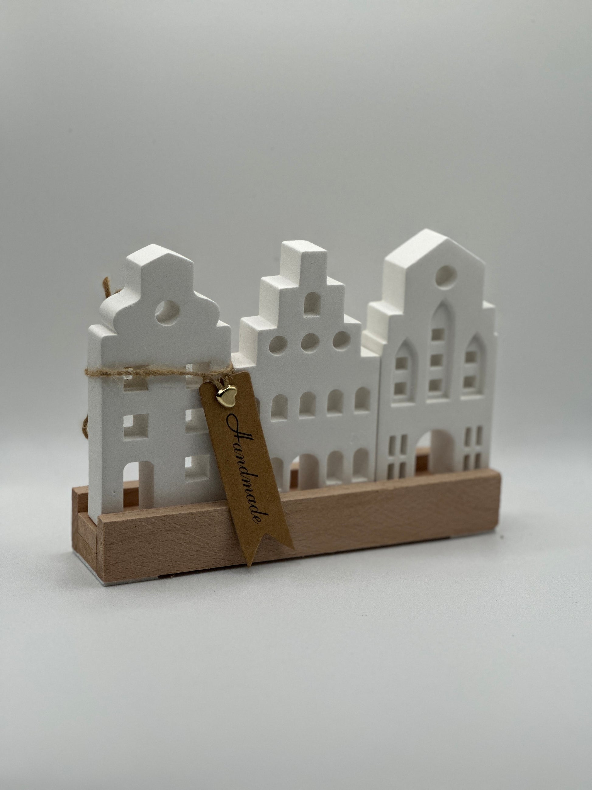 Drei Giebelhäuser, gefertigt auf einem Holzsockel, inspiriert vom Prinzipalmarkt in Münster sowie weiteren historischen Altstädten weltweit. Perfekt geeignet als stilvolles kleines Geschenk oder als dekorativer Blickfang für das Zuhause. Produziert im Münsterland aus hochwertigem Raysin-Material.